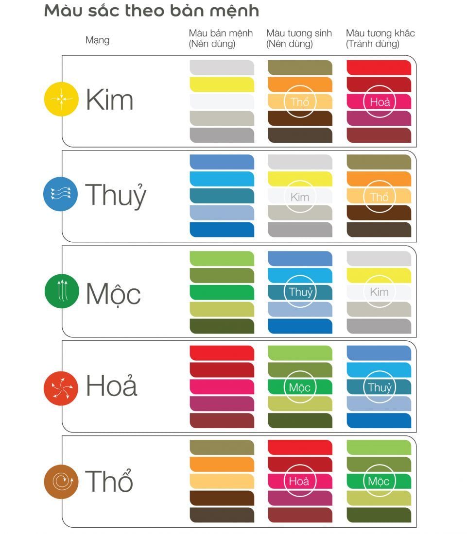 Mau son kieng ky: Tránh dùng các màu sắc liên quan đến mộc vì mộc khắc thổ và sẽ ảnh hưởng đến sự cần bằng về mặt phong thủy.